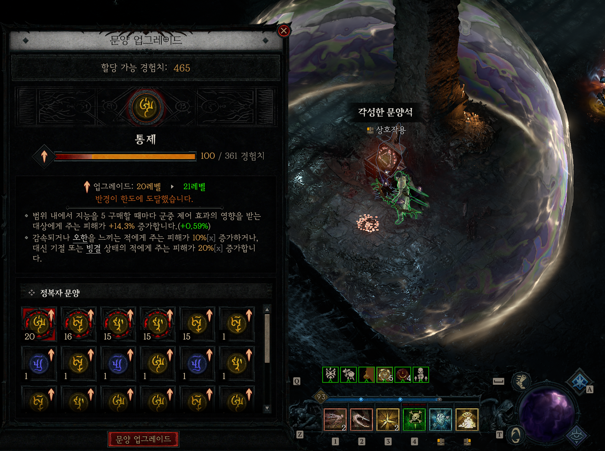 문장 레벨업은 각성한 문양석에서 한다. 정복자 보드에 박혀있는 문장을 골라서 레벨업 해주면 된다.