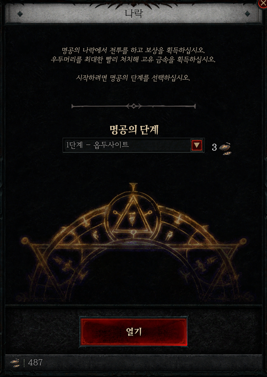 입장에 룬 파편이 필요하며, 1단계에서 시작하게 된다. 룬파편은 지옥물결 상자나, 악몽의 던전을 뺑뺑이 돌아서 수급할 수 있다. 이미 정복자 보드의 문장 만랩을 위해 악던 많이 돈 여러분들은 재료가 넉넉할 것이다.