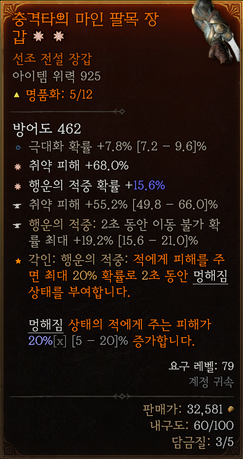 - 장갑: 행운의 적중 확률, 담금질 취약 피해