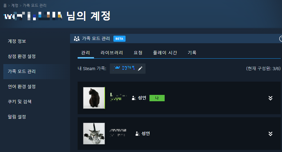 아래 Steam Families Beta 설정은 공유자, 공유 받는자 모두 필요하다