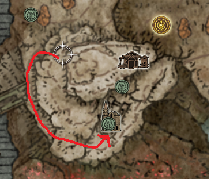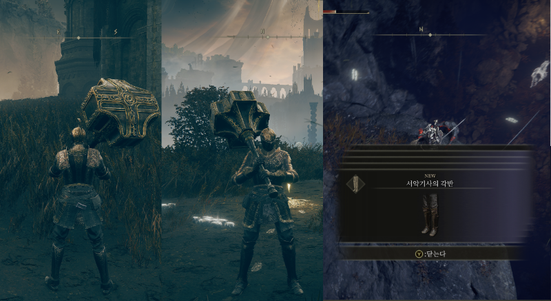지도 나무 무늬와 같이 교회 뒤쪽 절벽에 가까이 가면, 서약기사 세트와 파타를 얻을 수 있다. 절벽 타고 내려갈 수 있지만, 첨에 시작한 맵하고 연결되는 것 말고는 아무 것도 없으니 참고하자.