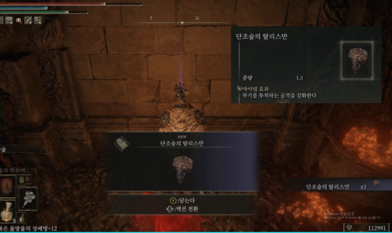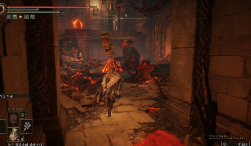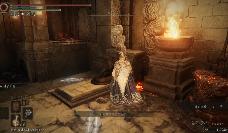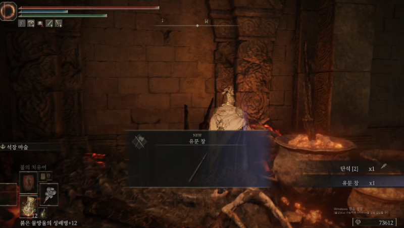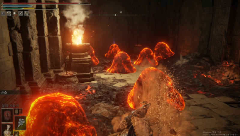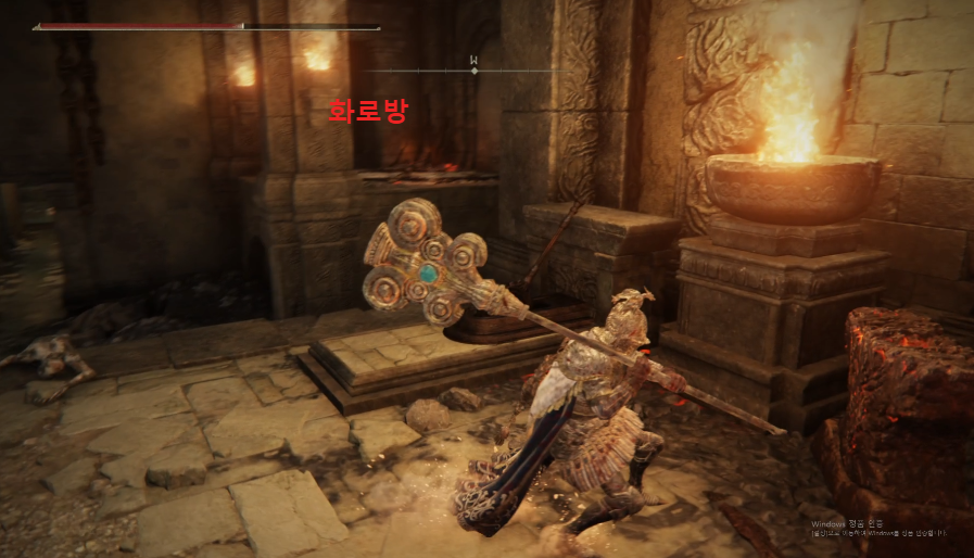 이제 다시 아까 레버로 돌아가자. 사다리타고 다시 올라가서 레버를 누르면 문이 올라오는데, 올라가기 전에 빠르게 문위로 탑승해서 문을 타고 올라가면 좌측에 화로방이 있다. (벽쪽으로 점프하면 문위에 타기 쉽다)