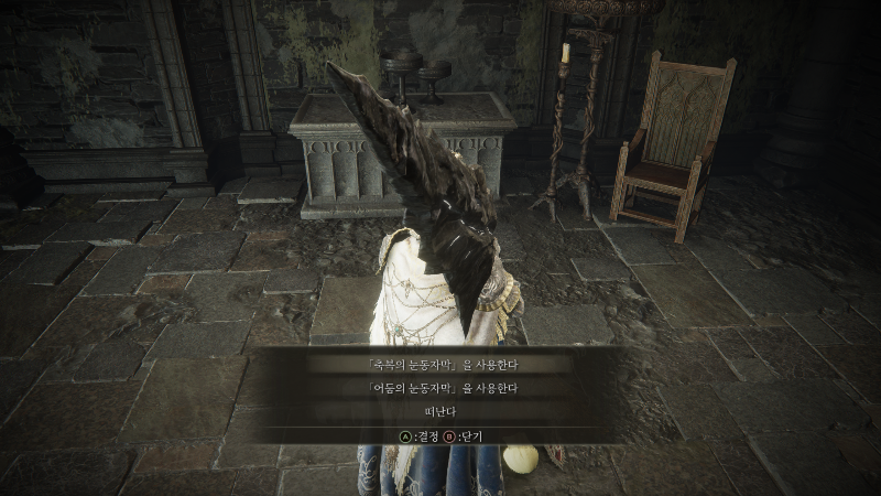 4) 그림자의 성 교구 방향에서 진입하여 퀼라인이 있는 방 문을 열어서 축복/어둠 중 선택하여 주기: 축복은 불의 기사 퀼라인의 뼛가루(약하다고한다..)를, 어둠의 눈동자막은 퀼라인의 대검을 보상으로 준다. (구체적으로 가는 길은 링크의 1번 참고)