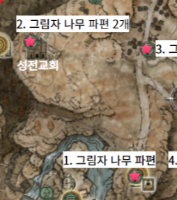 획득 아이템: 그림자 나무 파편, 어둠의 눈동자막, 가시두르기, 종군 사제의 제작서 1, 축복의 눈동자막, 불의 기사의 성인9번 바로 앞에서 그림자 나무의 화신 보스 전투 가능 그림자 성의 교구