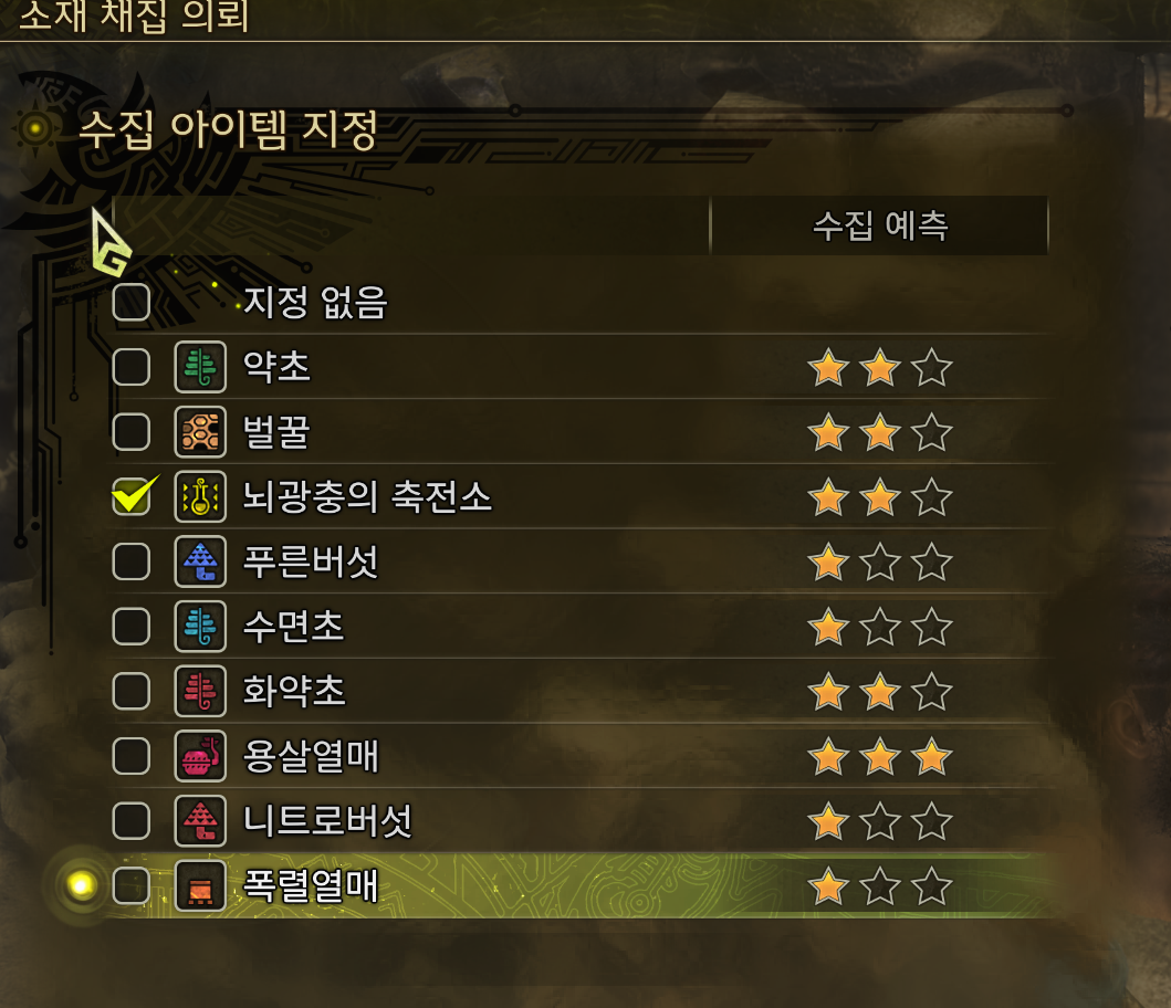 벌꿀, 수면초, 마비버섯, 뇌광충의 축전소등 편하게 채집해서 사용하자! (스토리를 끝내야 해금된다.)