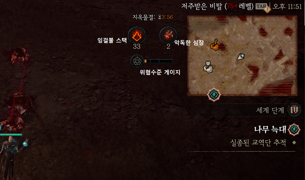 위협수준 게이지가 높아지면 몹 웨이브가 폭발적으로 나오고, 위협수준 게이지를 모두 소모할 쯤에 보스몹(지옥살이)이 나온다. 지옥살이는 불경한 정신체와 피의 여제 소환에 필요한 악독한 심장을 준다.
