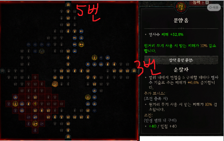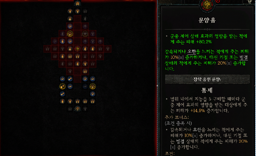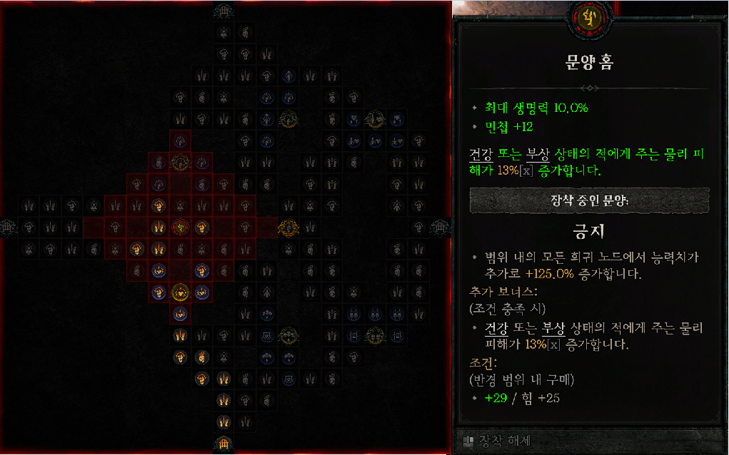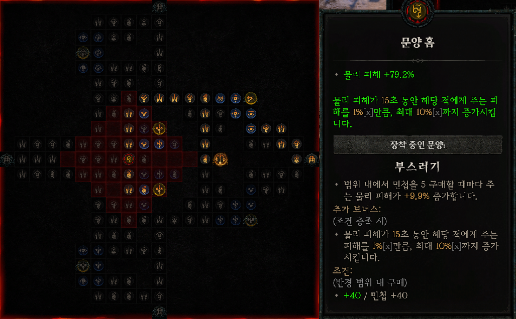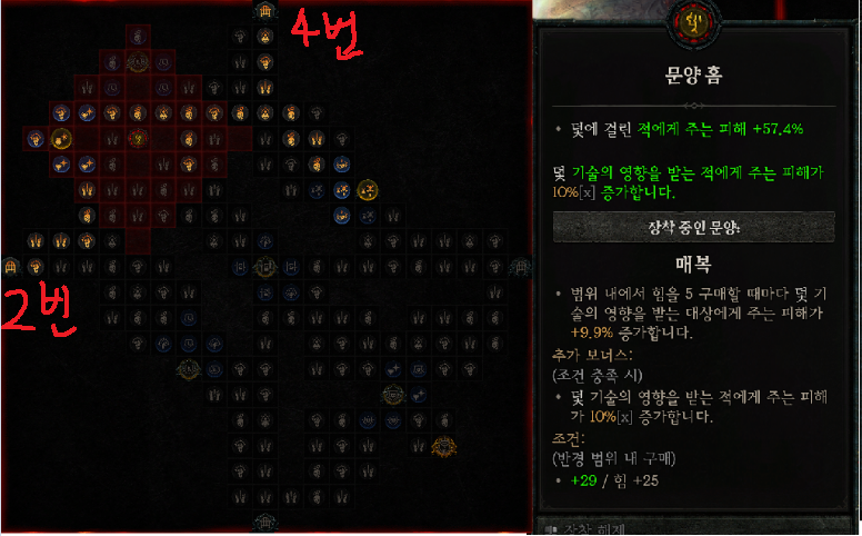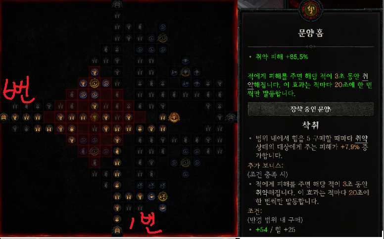 처음 정복자 찍으시는 분들은, 아래 스크린샷보다 빨간색 표기 범위(문양 조건 충족 범위)가 작은데 이는 문양을 15렙이상으로 만들면 문양 범위가 한칸 늘어난다. (문양 렙업은 악던에서.. 공략은 여기)